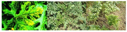 西瓜病毒病;西瓜病毒病,俗稱小葉病、花葉病,全國(guó)各地區(qū)均有發(fā)生,北方瓜區(qū)以花葉型病毒病為主,南方瓜區(qū)蕨葉型病毒病發(fā)生較普遍,尤以秋西瓜受害重。危害程度的輕重與種子帶菌率和蚜蟲發(fā)生數(shù)量密切相關(guān)。西瓜受害后,葉片變小,生長(zhǎng)緩慢,植株矮化,花器發(fā)育不良,嚴(yán)重的不能座果,或座果后發(fā)育不良,畸形,果小,產(chǎn)量低,品質(zhì)差,瓜瓤木質(zhì)化失去商品價(jià)值