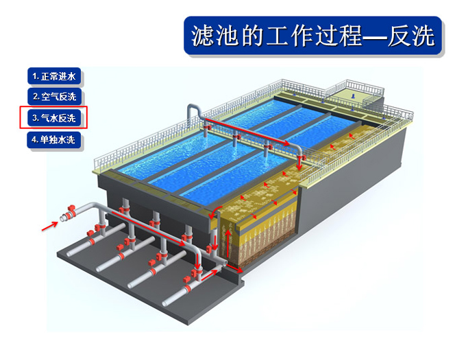 1、氣水聯(lián)合反沖冼裝置、布?xì)庋b置、操作工藝等系統(tǒng)集成技術(shù)解決直接過濾、生物濾池生物膜脫落堵塞濾池的問題。