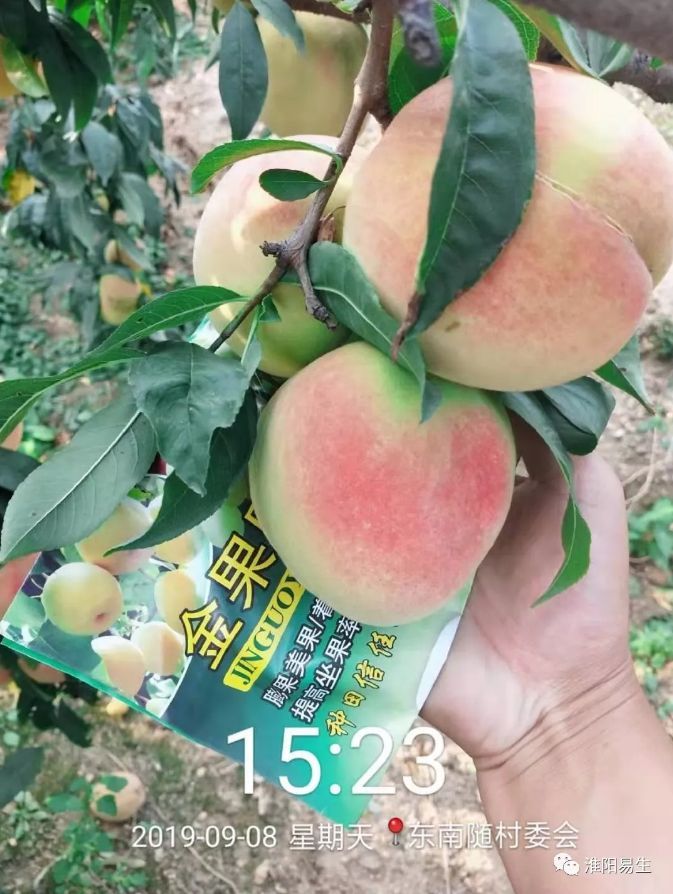 2019年易生科技售后服務(wù)組來到山東平度市店子鎮(zhèn)進行噴施金果園的效果回訪,可以看到噴施過金果園的毛桃個頭大且均勻,顏色鮮亮,上色均勻,每個毛桃直徑都在80-90mm以上。未噴施金果園的毛桃個頭小,且果皮表面有一層灰白色的物質(zhì),霧蒙蒙的感覺不鮮亮。